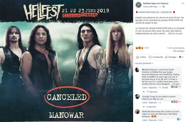 « Ce matin, malgré une présence sur site en ce jeudi 20 juin, les équipes et les membres du groupe Manowar ont décidé de quitter le site. Le concert de l’artiste Manowar prévu ce vendredi 21 juin ne pourra donc avoir lieu pour des raisons indépendantes de notre volonté. Nous sommes sincèrement désolés pour l’ensemble des fans de cet artiste et plus largement pour l’ensemble des fans du Hellfest », indique l’organisation.